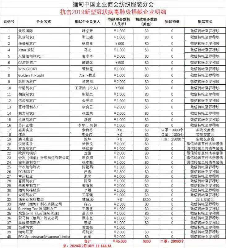 緬甸中國商會在1月27日即面向在緬中資企業發出了“緬甸中國企業商會支援祖國,抗擊新型冠狀病毒感染肺炎倡議書”,隨后成立了疫情防控和捐贈協調工作小組,設定專人分工負責捐贈事宜的協調和物資信息登記等工作。作為緬甸中國商會的主要分支機構,緬甸中國商會紡織服裝分會積極動員會員企業捐款捐物。截至2月10日,緬甸中國企業商會紡織服裝分會共收到在緬中資紡織服裝企業的捐款將近人民幣5萬元,以及捐贈口罩29000個。