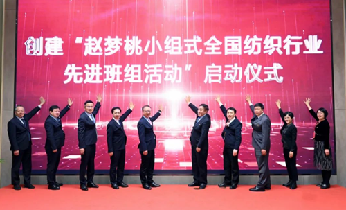 與會領(lǐng)導(dǎo)一起開啟創(chuàng)建“趙夢桃小組式全國紡織行業(yè)先進班組活動”啟動儀式。