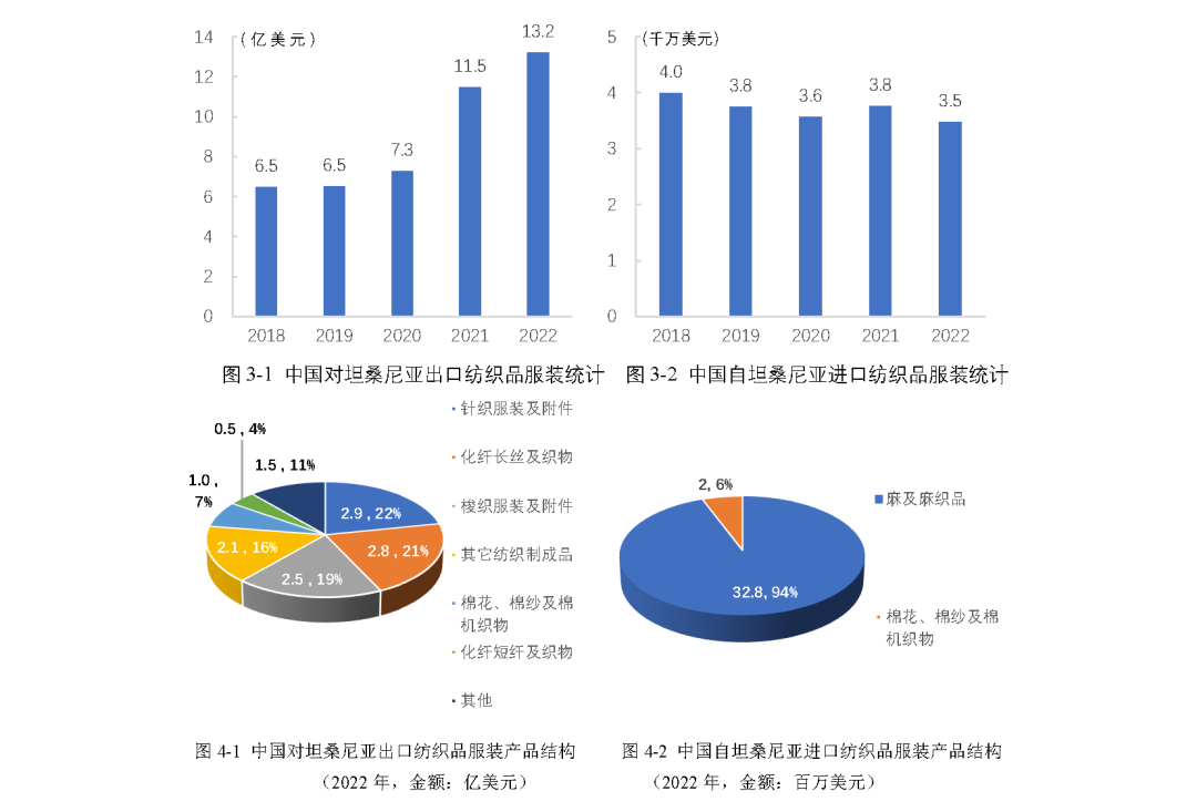 中國于1964年與坦桑尼亞建交,2022年兩國建立全面戰略合作伙伴關系。中國是坦桑尼亞第一大貿易伙伴、第一大外資來源國,2022年,中坦雙邊貿易額為83.1億美元。中國是坦桑尼亞重要的紡織品服裝貿易伙伴,為坦桑尼亞提供服裝產品和少許面料,坦桑尼亞為中國提供少許劍麻和棉花原料。根據中國海關統計,2022年,中國與坦桑尼紡織品服裝進出口總額為16.7億美元,其中,中國對坦桑尼亞出口額為13.2億美元,主要出口產品為針織服裝(占比22%)、化纖長絲及織物(占比21%)、梭織服裝(占比19%)等;自坦進口額為3.5億美元,進口產品僅有麻及麻織品(占比94%),棉花、棉紗及棉機織物(6%)。