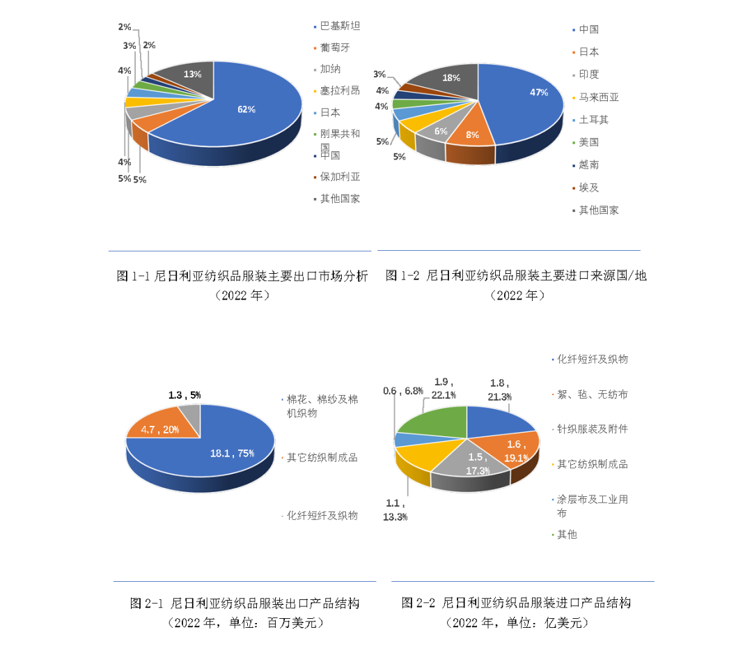 尼日利亞紡織產業對外貿易規模較小,進出口總額不足2億美元,出口以棉花為主,進口產品較為分散。根據尼日利亞國家統計局數據,2022年,尼日利亞紡織品服裝(海關HS編碼50~63章紡織原料、紡織品及服裝)出口額僅為472萬美元,主要出口市場是巴基斯坦、葡萄牙、加納、塞拉利昂,其中巴基斯坦占出口總額的62%,棉花是主要出口產品,占紡織品服裝出口總額的75%。同期,紡織品服裝進口額為1.1億美元,中國是尼日利亞第一大進口來源國,約占進口總額的47%,其次是日本、印度、馬來西亞等。進口產品較為分散,化纖短纖及織物,絮、氈、無紡布,針織服裝三大類產品所占比重均為20%左右。