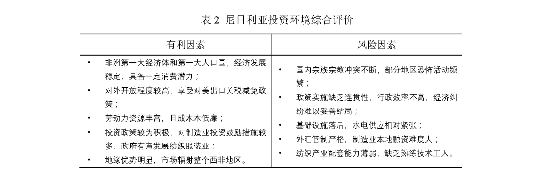 (2)對外開放程度整體較高,政府發展棉紡、化纖等紡織產業鏈上游環節的意愿較強,對紡織產業外國投資持歡迎態度,且擁有數量充足且成本相對低廉的勞動力,對美國出口紡織品服裝享受關稅減免政策,為在當地發展出口加工型企業提供了較好環境。考慮要素條件及政策環境,尼日利亞在發展棉紡織、服裝加工等領域具有一定投資條件。