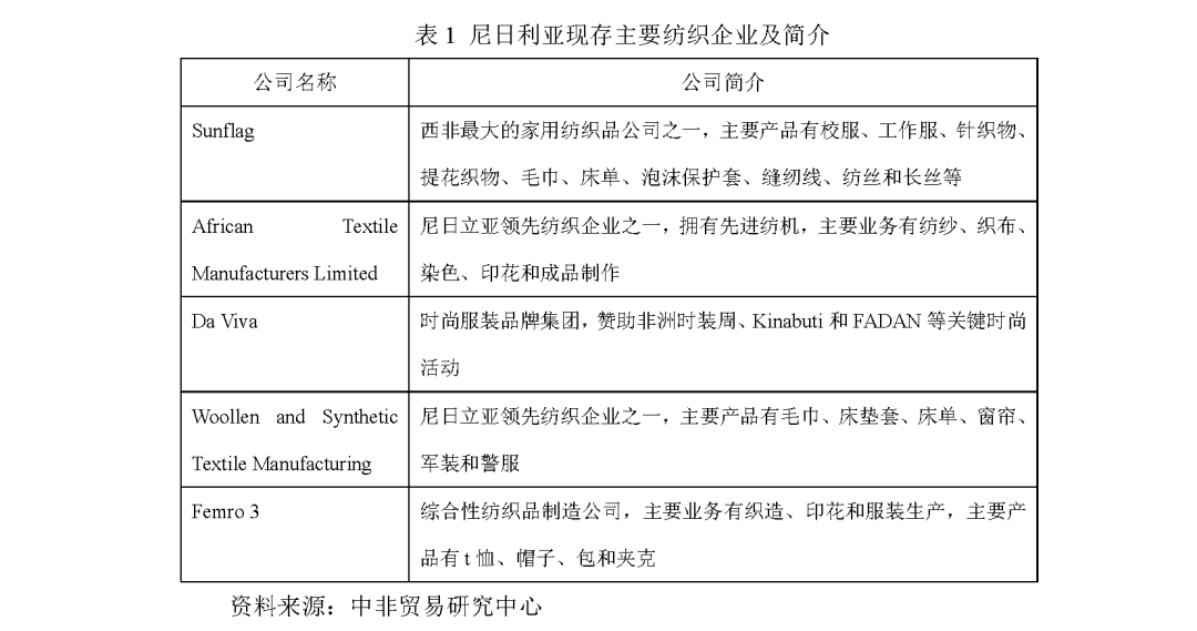 尼日利亞紡織企業大多集中在港口城市拉各斯及其周邊區域。邦德克里克工業園始建于2014年,以紡織為主要產業。現存較大的紡織公司有Sunflag、African Textile Manufacturers Limited、Da Viva、Woollen and Synthetic Textile Manufacturing、Femro 3等,公司簡介見下表。