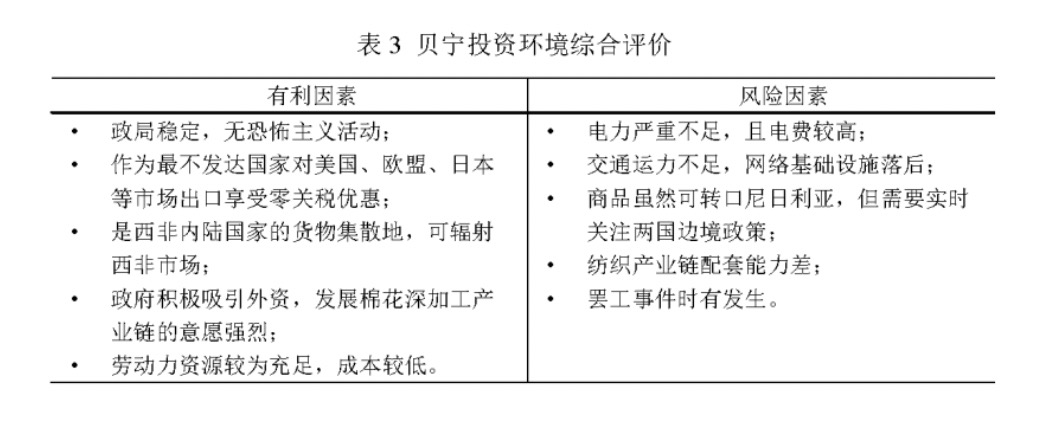 (1)貝寧政局穩(wěn)定,棉花資源較為豐富,政府提高棉花本地加工率、發(fā)展棉紡織深加工業(yè)意愿強(qiáng)烈,在美國(guó)、歐盟、日本等絕大多數(shù)市場(chǎng)均享受零關(guān)稅優(yōu)惠政策,可輻射西非市場(chǎng),均是中國(guó)紡織企業(yè)赴貝寧投資的有利因素。