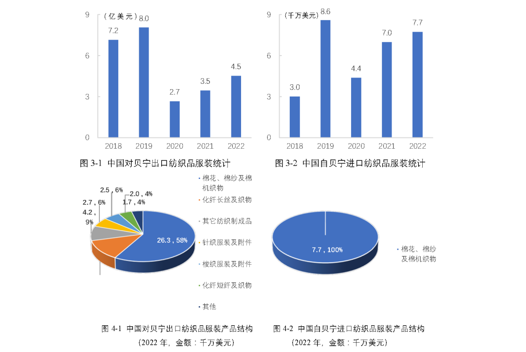 紡織行業(yè)在中貝雙邊貿(mào)易中扮演重要角色,根據(jù)中國(guó)海關(guān)統(tǒng)計(jì),2022年,中國(guó)與貝寧紡織品服裝進(jìn)出口總額為5.3億美元,占中貝雙邊貿(mào)易總額的比重超過(guò)1/4。其中,中國(guó)對(duì)貝寧紡織品服裝出口額為4.5億美元,主要出口產(chǎn)品為棉紗及棉機(jī)織物(占比58%)、化纖長(zhǎng)絲及織物(占比13%)等;自貝寧進(jìn)口額為7720萬(wàn)美元,進(jìn)口產(chǎn)品只有棉花。