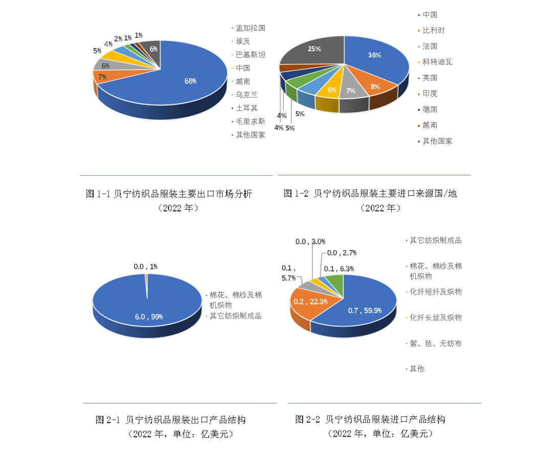 貝寧紡織品服裝貿(mào)易規(guī)模較小,幾乎僅出口棉花,進(jìn)口品類(lèi)相對(duì)分散。根據(jù)貝寧國(guó)家經(jīng)濟(jì)分析與統(tǒng)計(jì)局?jǐn)?shù)據(jù),2022年,貝寧紡織品服裝(海關(guān)HS編碼50~63章紡織原料、紡織品及服裝)出口額為6.1億美元,主要出口市場(chǎng)是孟加拉國(guó)、埃及、巴基斯坦、中國(guó),其中孟加拉國(guó)占出口總額的68%。從出口品類(lèi)看,棉花出口額占紡織品服裝出口總額的99%。同期,紡織品服裝進(jìn)口額為1.1億美元,中國(guó)是第一大進(jìn)口來(lái)源地,約占進(jìn)口總額的36%,其次是比利時(shí)、法國(guó)、科特迪瓦等。主要進(jìn)口產(chǎn)品是終端紡織制成品(占比59.9%),棉花、棉紗及棉機(jī)織物(占比22.3%)。