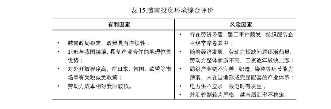 (3)近年來(lái),越南勞動(dòng)力成本上漲較快,罷工事件時(shí)有發(fā)生,環(huán)保要求較高,我國(guó)紡織企業(yè)應(yīng)全面做好成本核算,充分考慮勞資糾紛、環(huán)保、限電等風(fēng)險(xiǎn)因素。