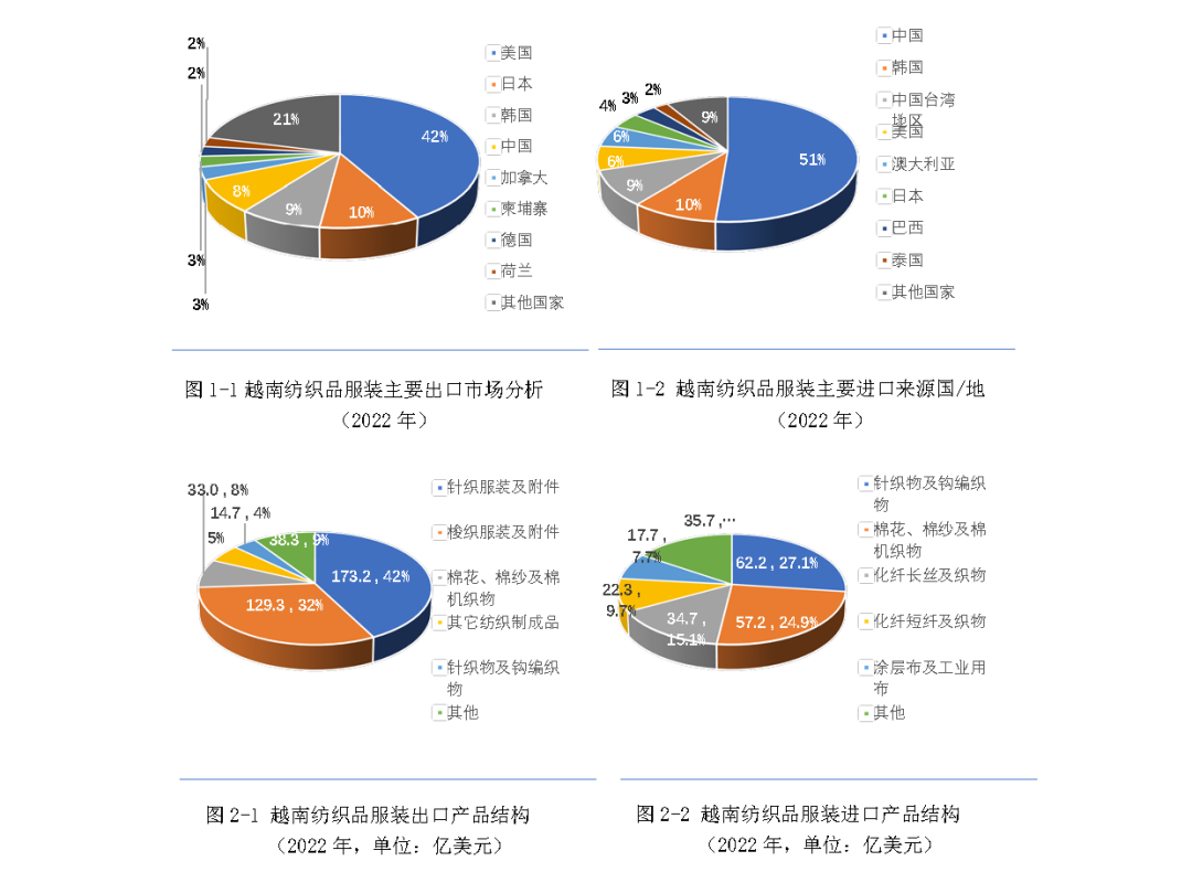 目前,越南是世界第二大紡織品服裝出口國(guó)(僅次于中國(guó)),第三大服裝出口國(guó)(僅次于中國(guó)、孟加拉),出口產(chǎn)品以服裝為主,進(jìn)口以纖維原料、紗線及面料為主。根據(jù)聯(lián)合國(guó)數(shù)據(jù),2022年,越南紡織品服裝(海關(guān)HS編碼50~63章紡織原料、紡織品及服裝)出口額為409.4億美元,主要出口市場(chǎng)是美國(guó)、日本、韓國(guó)、中國(guó),其中對(duì)美國(guó)出口額占出口總額的42%。服裝是主要出口產(chǎn)品,占紡織品服裝出口總額的74%,其中針織服裝占比高達(dá)42%。同期,越南紡織品服裝進(jìn)口額為229.9億美元,中國(guó)是越南第一大進(jìn)口來(lái)源地,約占進(jìn)口總額的51%,其次為韓國(guó)、中國(guó)臺(tái)灣地區(qū)、澳大利亞等。主要進(jìn)口產(chǎn)品為針織物及鉤編織物(占比27.1%),棉花、棉紗及棉機(jī)織物(占比24.9%),化纖長(zhǎng)絲及織物(占比15.1%),化纖短纖及織物(占比9.7%)。