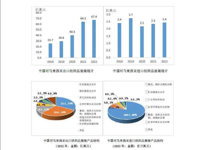 馬來西亞是第一個(gè)與中國建交的東盟國家,也是中國在“一帶一路”沿線的第四大紡織品服裝貿(mào)易伙伴。據(jù)中國海關(guān)統(tǒng)計(jì),2022年中國與馬來西亞紡織品服裝進(jìn)出口總額為69.8億美元,其中出口額67.4億美元,進(jìn)口額2.4億美元。中國紡織行業(yè)對馬來西亞主要出口產(chǎn)品包括針織服裝及衣著附件(占比32.7%)、梭織服裝及衣著附件(占比29.1%)等;主要進(jìn)口產(chǎn)品為棉花、棉紗及棉機(jī)織物,占比高達(dá)79.9%。