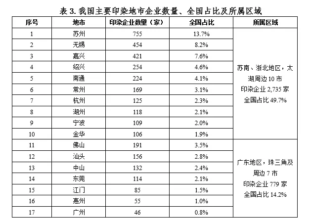 根據(jù)數(shù)據(jù)分析,全國印染企業(yè)保守數(shù)量5,505家,主要分布在太湖周邊和大灣區(qū)地區(qū)。以蘇州、無錫、嘉興、南通、紹興、常州等10市為代表的太湖流域,印染企業(yè)數(shù)量2,735家,全國占比49.7%;其次為以佛山、汕頭、中山、東莞等7市為代表的大灣區(qū)地區(qū),印染企業(yè)數(shù)量779家,全國占比14.2%。上述兩地區(qū)印染企業(yè)合計數(shù)量3,514家,全國占比63.9%,見表3。