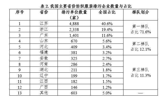 從排污企業(yè)數(shù)量的省份分布看,江蘇、浙江和廣東三省企業(yè)數(shù)量合計占比71.6%但相差懸殊,企業(yè)數(shù)量分別為4,888家、2,338家和1,401家,屬于第一梯隊;其次為山東、河北和福建,屬于第二梯隊,企業(yè)數(shù)量合計占比12.1%;安徽、河南、湖北、遼寧、江西和廣西屬于第三梯隊,企業(yè)數(shù)量合計占比11.3%,見表2。