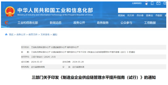 ?為加快實施制造業供應鏈提升工程,推動現代供應鏈體系深度嵌入制造業產業鏈,工業和信息化部會同交通運輸部、商務部近日印發《制造業企業供應鏈管理水平提升指南(試行)》。