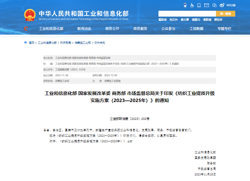 近日工業(yè)和信息化部、國家發(fā)展改革委、商務(wù)部、市場監(jiān)管總局等四部門聯(lián)合印發(fā)《紡織工業(yè)提質(zhì)升級實施方案(2023—2025年)》。