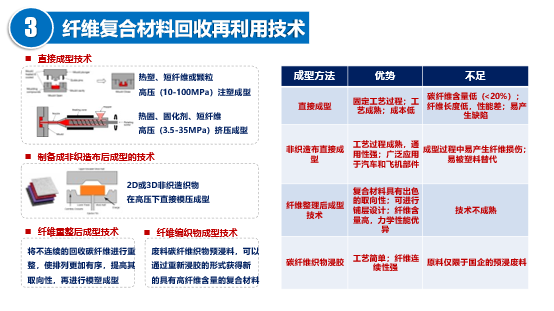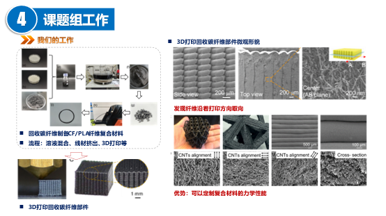 史寶會老師介紹了纖維復合材料的回收意義、回收方法、以及回收再利用技術。史寶會老師指出,機械回收法是纖維復合材料回收的最主要方法。目前,纖維復合材料回收再利用技術主要分為四種:直接成型、非織造布直接成型、纖維整理后成型技術、以及碳纖維織造浸膠。另外,史寶會老師團隊研究發現,3D打印回收碳纖維是隨著打印部件的方向而取向的,同時發現打印的短碳纖維熱塑復合材料部件具有優異的熱穩定性,且可用于多種場景,包括服裝的制作,紗線的制作、電池的制作等。