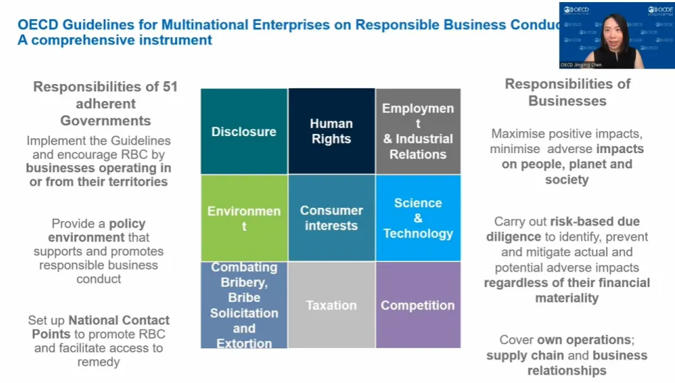 經(jīng)合組織(OECD)金融和企業(yè)事務(wù)局負(fù)責(zé)任商業(yè)行為中心政策顧問及國別負(fù)責(zé)人陳晶晶女士通過視頻形式介紹了經(jīng)合組織的盡責(zé)管理標(biāo)準(zhǔn)、方法及其對品牌與供應(yīng)商關(guān)系的影響。