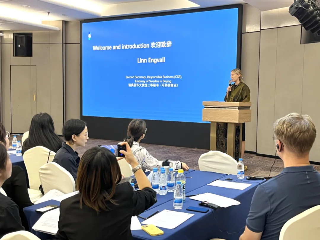 瑞典駐華大使館企業(yè)社會(huì)責(zé)任中心主任(可持續(xù)商業(yè)二等秘書)Linn Engvall女士在開場致辭中表示,希望大家能夠通過此次培訓(xùn)研討會(huì)更加深入地了解供應(yīng)鏈盡責(zé)管理的相關(guān)知識和工具,提升供應(yīng)鏈責(zé)任管理能力,推動(dòng)企業(yè)和行業(yè)可持續(xù)發(fā)展。