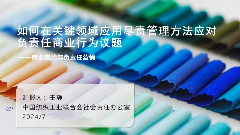 中國紡織工業(yè)聯(lián)合會(huì)社會(huì)責(zé)任辦公室研究員王靜女士就《如何在關(guān)鍵領(lǐng)域應(yīng)用盡責(zé)管理方法應(yīng)對負(fù)責(zé)任商業(yè)行為議題》,和參會(huì)嘉賓探討了ESG與盡責(zé)管理的關(guān)系,介紹了行業(yè)營銷實(shí)踐中的常見風(fēng)險(xiǎn)因素,并詳細(xì)解讀了如何運(yùn)用盡責(zé)管理工具管控商業(yè)賄賂與貪腐風(fēng)險(xiǎn),號召企業(yè)加強(qiáng)合規(guī)管理。