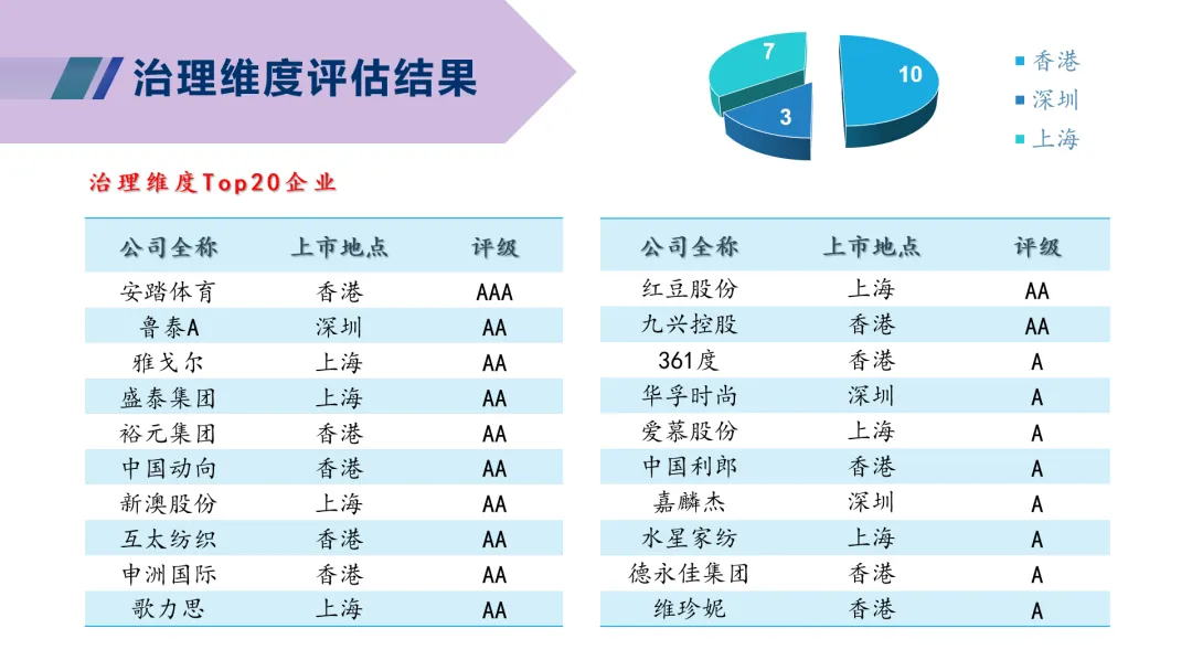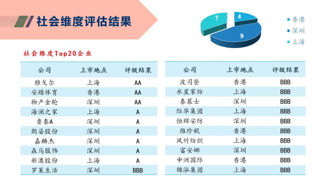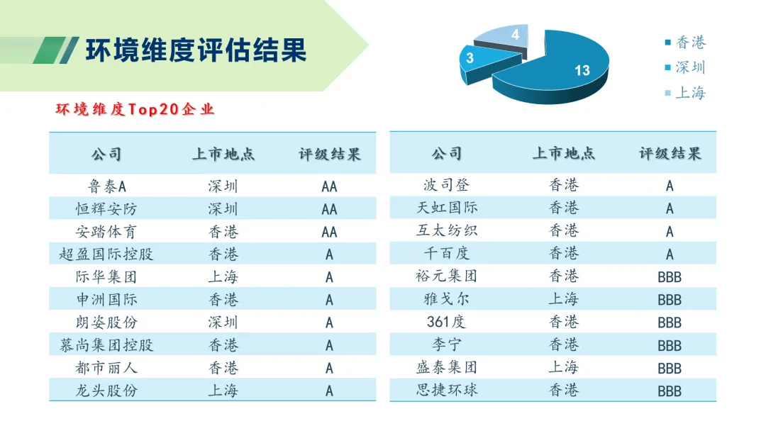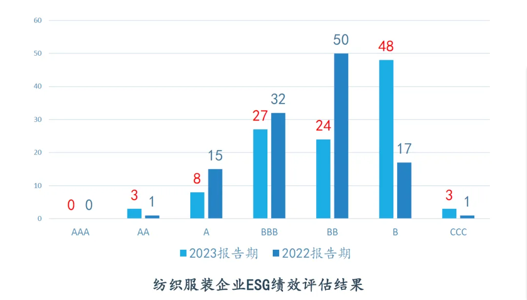相較2022報告期紡織服裝上市企業總體ESG評級處在高分區間的數量有所下降,未有企業達到AAA級,雖然達到AA級的企業數量有所增加,但達到A級的企業數量減少較多。處在低分區間的企業數量也有所提升,B級企業增加182%,提示企業對于更新及更細致的ESG信息披露要求的回應較為不及時,仍有較大的進步空間。
