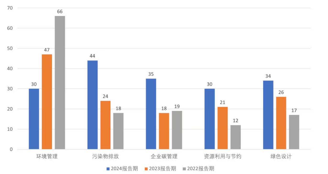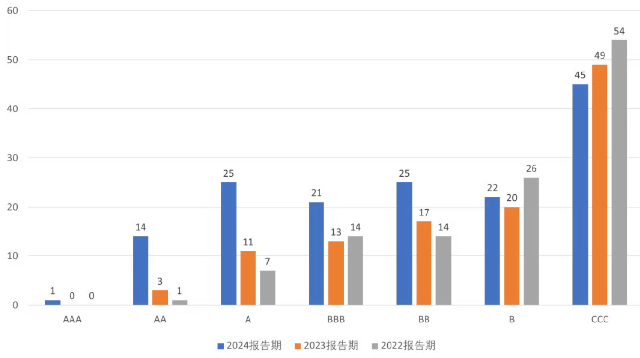 環(huán)境評估中,分布結構呈現(xiàn)出典型的“金字塔”形態(tài),行業(yè)內部分化與梯隊差距顯著。較于2023報告期,行業(yè)整體在環(huán)境維度的評估提升較大,頭部企業(yè)率先加大了在環(huán)境方面的投入與披露;然而,行業(yè)平均分仍處于較低水平,且CCC級企業(yè)數量龐大。