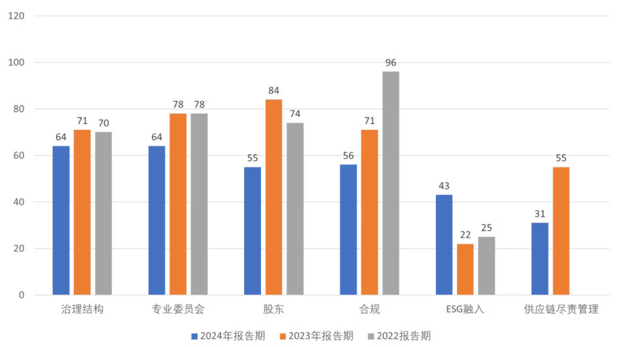 公司治理評估中,上市企業(yè)信息披露差異性相較其他維度較小。相較于2023報告期,評估結構明顯下沉,BBB及以上企業(yè)比例下降,BB級比例更由不到5%跳升至三成以上,并首次出現(xiàn)B級和CCC級企業(yè),尾部風險顯著抬升。造成這種變化的首要原因是供應鏈盡責管理要求的提升。